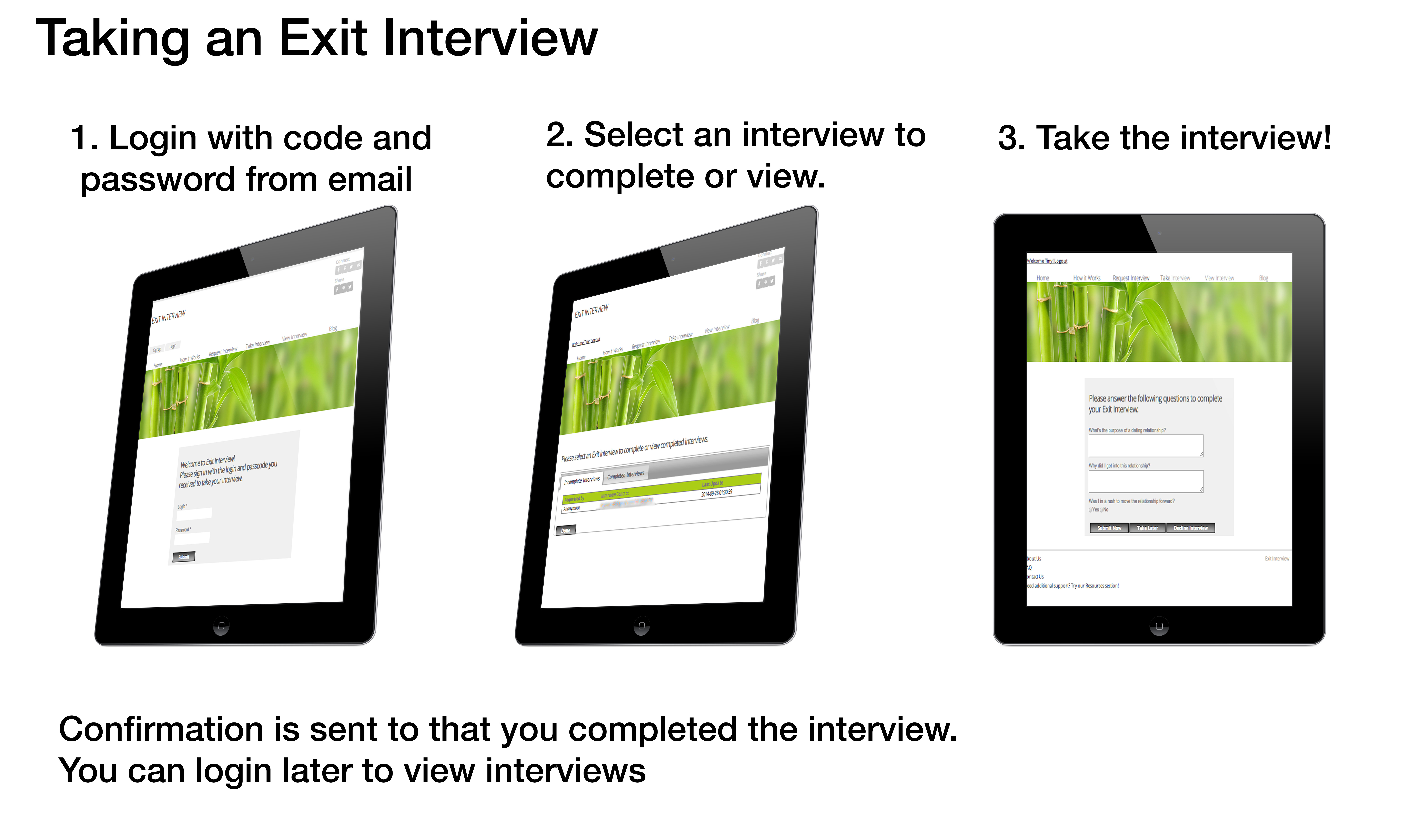 Ever been in a relationship that went awry but you had no way to know why or how? Think of how much the relationship would have been if you were able to part ways with the information you needed to know about what went wrong? Exit Interview Online might be the answer to that. Exit Interview Online’s web based platform lets users build personalized exit interview requests by selecting from a set of tailored questions, developed by an on-staff therapist. Interviews are confidential, anonymous, and can be sent to anyone via text, email, or by requesting a phone consultation with a therapist.