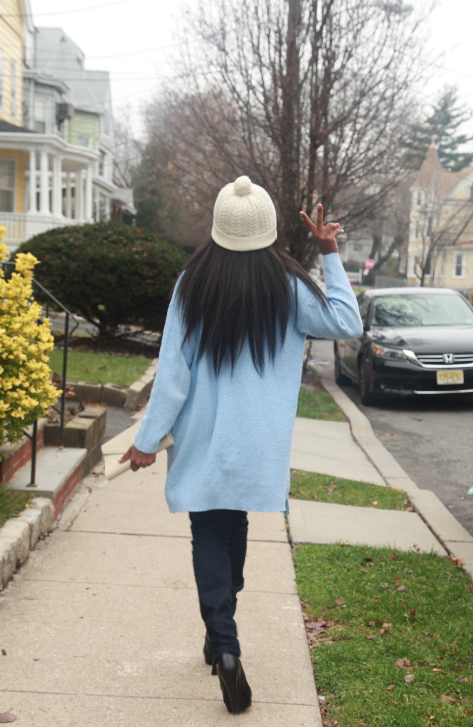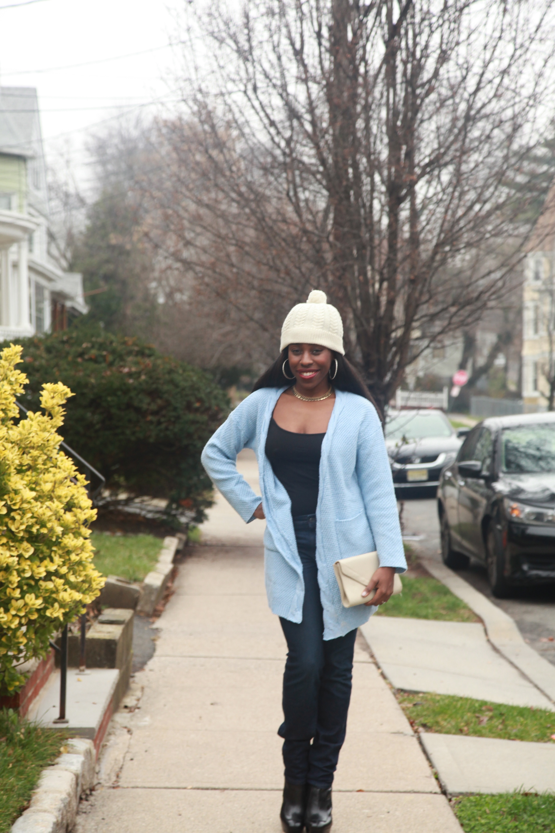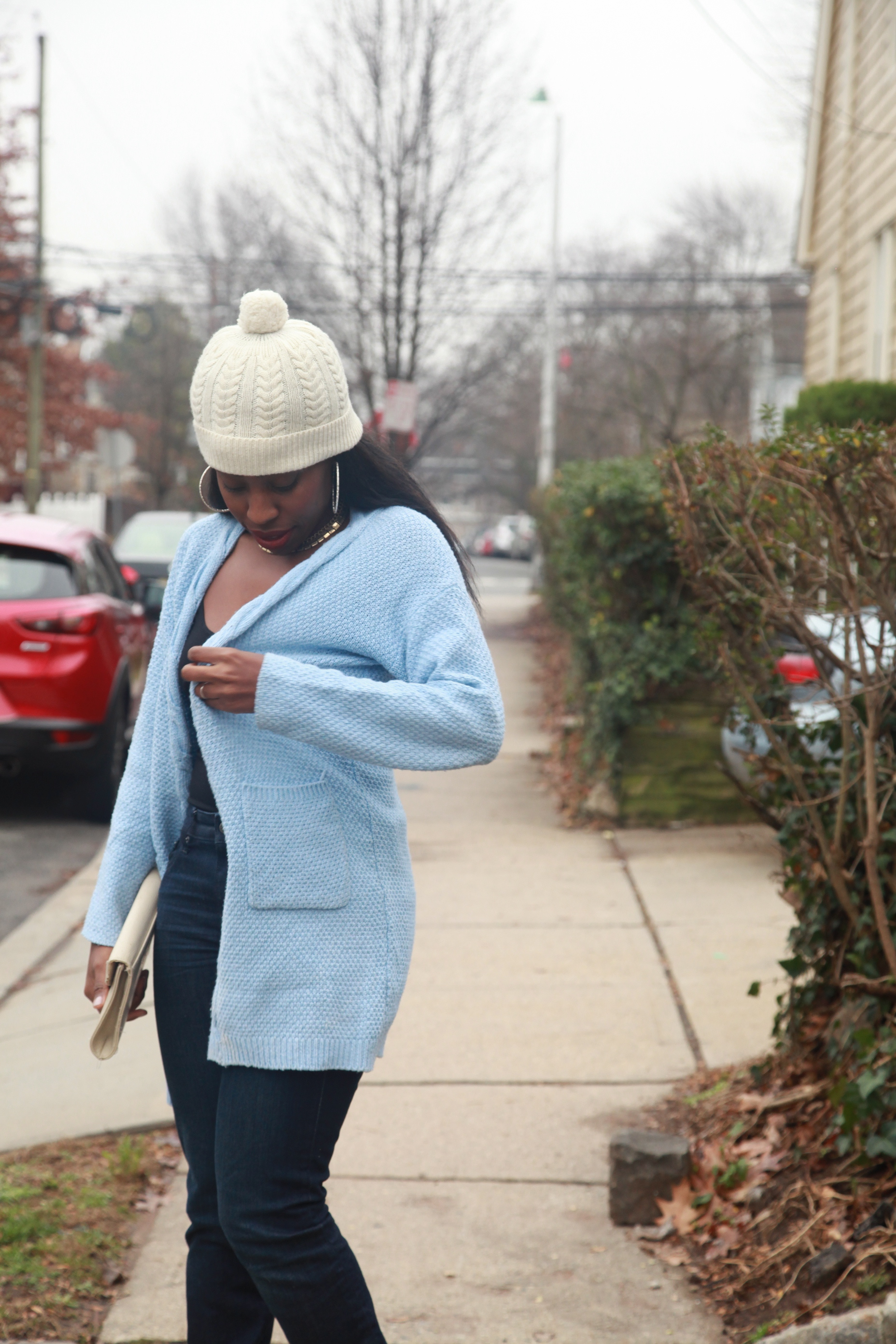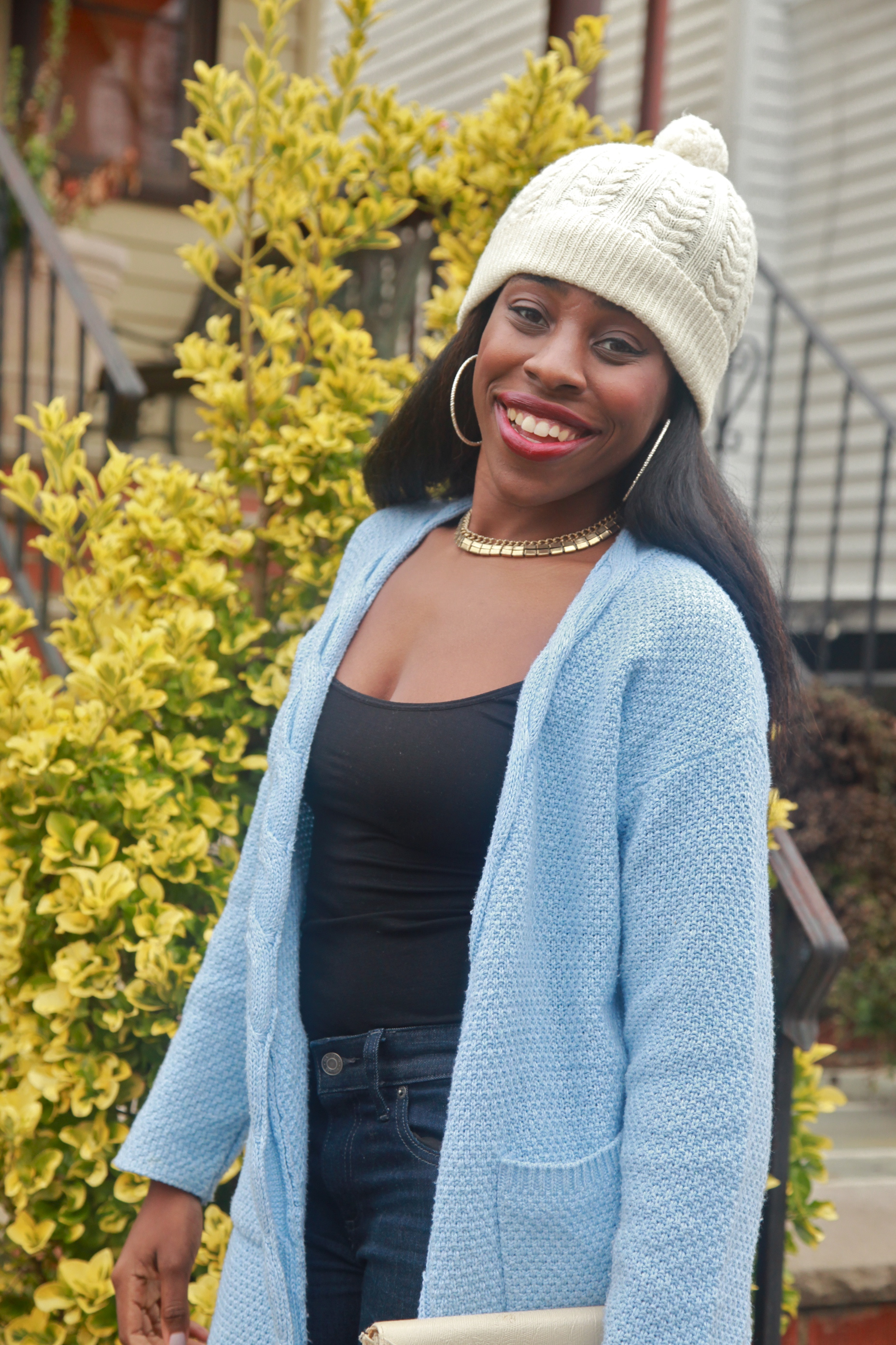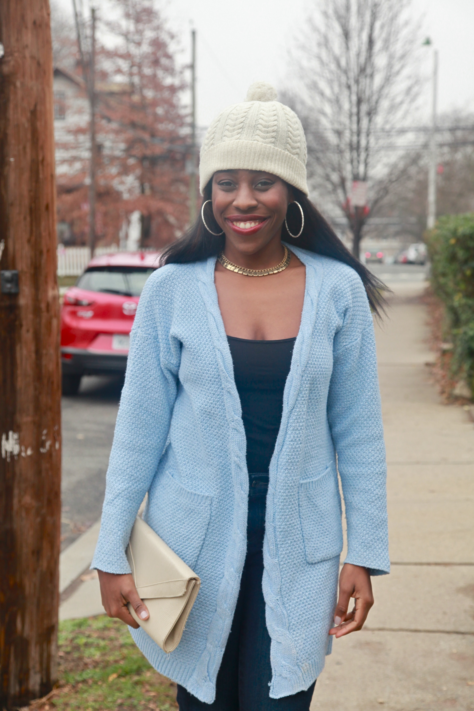 - Make sure the cardigan is the focal point of the outfit, but don’t be afraid to pair it with another statement piece. (It was a bit cold outside, so I put on a hat!)